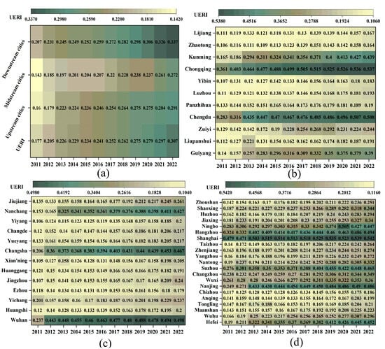 Figure 3. UERI of cities along the Yangtze River (a), Upstream cities (b), Midstream cities (c), Downstream cities (d).