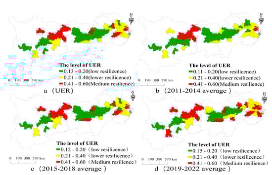 Figure 4. Spatial distribution of UER along the Yangtze River (a), 2011–2014 average (b), 2015–2018 average (c), 2019–2022 average (d).