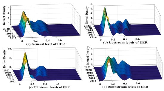 The distribution pattern demonstrates that the main peak’s height in the UER along the Yangtze River, as well as in the upstream, midstream, and downstream cities, has increased to varying degrees, while their widths have contracted. This indicates a trend towards decreasing absolute differences in UER across these regions. The kernel density curve for downstream cities exhibits a “rising–declining–rising” pattern, reflecting a significant narrowing of the absolute UER differences in these urban areas.