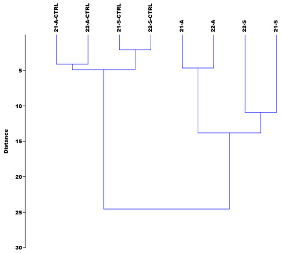 Result of unweighted pair-group average (UPGMA) analysis (21—2021, 22—2022, S—spring, A—autumn, CTRL—natural control).