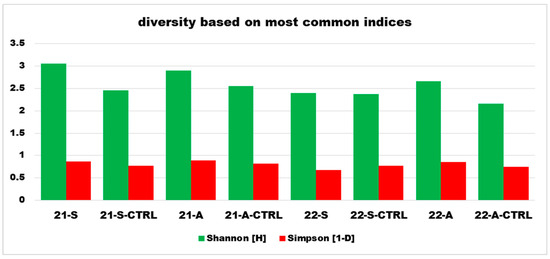 Diversity based on Shannon and Simpson diversity indices (21–2021, 22–2022, S—spring, A—autumn, CTRL—natural control).