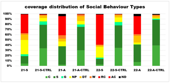 Coverage distribution of social behaviour types—for abbreviations, see Section 2.3 and Section 3.3 (21–2021, 22–2022, S—spring, A—autumn, CTRL—natural control).