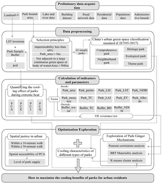 (4) Optimization Exploration: Pearson correlation analysis and the Boosted Regression Trees (BRT) method are employed to examine the cooling mechanisms of parks. Additionally, K-means clustering is utilized to classify parks according to their cooling capacities. ArcGIS spatial network analysis is employed to assess and map the spatial equity of urban parks. This methodology addresses the practical challenge of optimizing the cooling benefits provided by parks to residents.