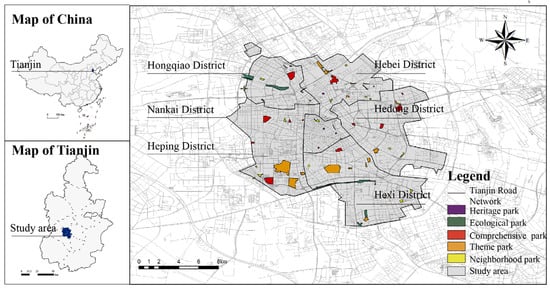 Tianjin, a representative coastal city in China (116°43′—118°04′ E, 38°34′—40°15′ N), is located with the Yanshan Mountains to the north and the North China Plain to the south, and it faces the Bohai Bay to the southeast. The city’s topography generally slopes from north to south, and it is subject to a temperate continental monsoon climate, characterized by hot and rainy summers as well as cold and dry winters. The annual average maximum temperature in Tianjin is 21 °C, the minimum average is 10 °C, the average wind speed is 9 km/h, and the average visibility is 16.1 km (www.tianqi24.com, accessed on 17 July 2022). Considering the potential impact of local climate variations across extensive study areas and the more pronounced urban heat island effect observed in city centers [,], this study is focused on the high-density core areas of Tianjin, specifically the six central districts: Heping District, Hexi District, Nankai District, Hedong District, Hebei District, and Hongqiao District (Figure 2).