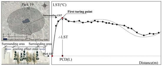 As illustrated in Figure 3, the distance corresponding to the first descending inflection point of the cooling curve is defined as the Park Cooling Distance (PCD). The area of the buffer zone at this inflection point represents the park’s maximum cooling area (PCA). Additionally, the park’s cooling efficiency (PCE) is evaluated by the ratio of the park’s cooling area to its total area, reflecting the economic effectiveness of the park’s cooling impact. The temperature difference at the inflection point within the park defines the Park Cooling Intensity (PCI), where a higher PCI value indicates a more significant cooling effect for residents. The ratio of PCI to the maximum cooling distance is termed the Park Cooling Gradient (PCG). A high PCG value signifies a concentrated high-heat absorption cooling effect, while a low PCG value denotes a widespread low-heat absorption process [].
