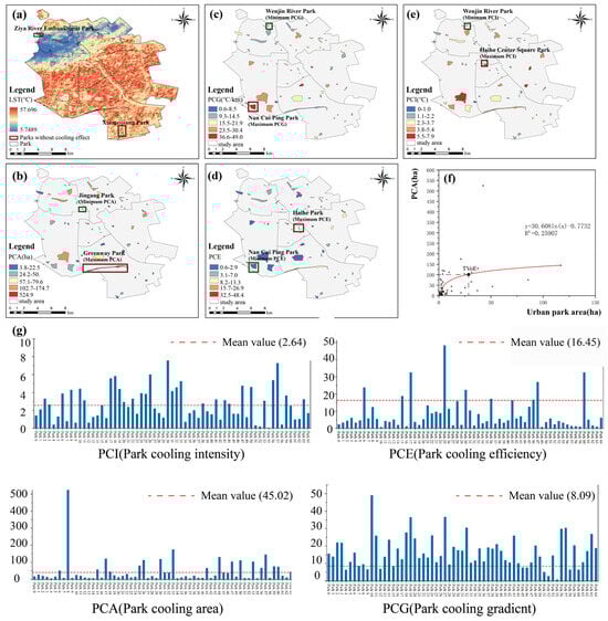 (a) Surface temperature inversion, (b–e) spatial pattern of cooling metrics in urban parks, (f) threshold value of efficiency (TVoE) of the urban park area. (g) Cooling indexes of the 65 urban parks.