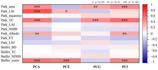 The Park Cooling Intensity (PCI) is significantly positively correlated with the park’s internal albedo (p ≤ 0.01), park area, and canopy area (p ≤ 0.001), as well as with the area of external water bodies (p ≤ 0.001). These findings suggest that increased internal albedo, larger park area, denser canopy, and greater external water body areas enhance the park’s cooling intensity, resulting in a more pronounced cooling effect experienced by residents.