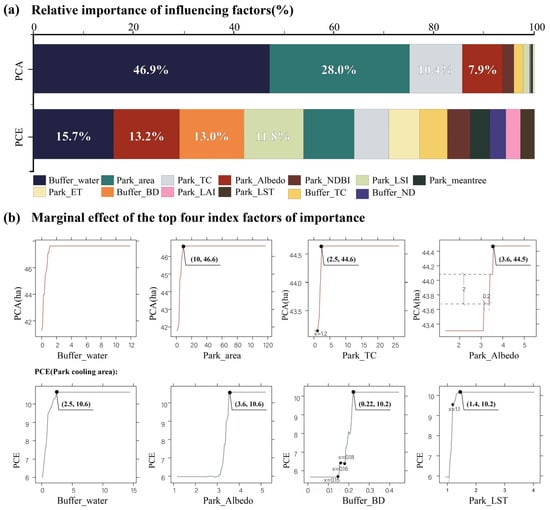 Utilizing the BRT model, the factors influencing the Park Cooling Area (PCA) and Park Cooling Efficiency (PCE) were analyzed (Figure 6a). In the importance analysis, R2 values of 0.7 and 0.5 were obtained for the two indicators, respectively, indicating that the model’s accuracy meets the prediction requirements. The analysis reveals that, under extreme high-temperature conditions, the area of external water bodies is the most significant factor affecting PCA (46.94%), followed by park area (28.01%), canopy area within the park (10.47%), and albedo within the park (7.97%). For PCE, the most influential factor is the area of external water bodies (15.73%), followed by albedo within the park (13.25%), building density outside the park (13.07%), and park shape index (11.8%). Both external water bodies and internal albedo have substantial impacts on cooling effects and thus warrant focused attention.