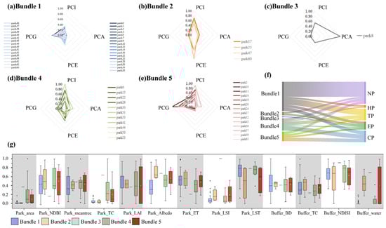 (a–e) Five cooling capacity bundles for city parks. (f) Sankey diagrams of the Park Bundle. (g) Characterization of different bundles of cooling capacity (NP: neighborhood park; HP: heritage park; TP: theme park; EP: Ecological parks; CP: comprehensive park).
