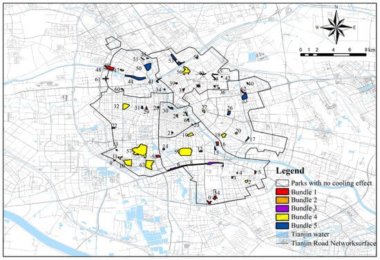 K-means clustering was utilized to categorize 63 parks exhibiting cooling effects into 5 distinct clusters based on variations in their cooling capacities (Figure 7a–e). The characteristics of these clusters are as follows: Bundle 1 includes parks with relatively low values across all four cooling metrics, indicating a weaker overall cooling effect. This bundle comprises 33 parks, predominantly neighborhood parks and theme parks (Figure 7f). Compared to the other clusters (Figure 7g), parks in Bundle 1 are generally smaller, have more regular shapes, smaller canopy areas, and lower albedo values. Additionally, parks in Bundle 1 are located in areas with higher building density and have the smallest water body area among the five clusters. Spatially, parks in Bundle 1 are predominantly situated in the internal core regions, characterized by higher building density and greater human activity intensity (Figure 8).