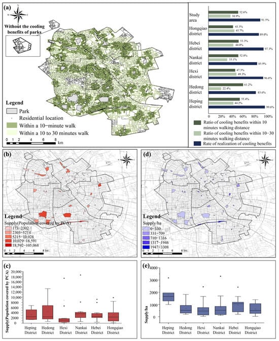 (a) Mapping Equity in Urban Parks. (b–c) Supply of park cooling services. (d,e) Supply of park services per unit area.