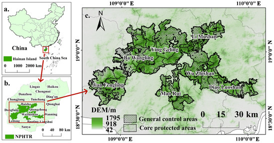 Location and features of the study area. Notes: (a) China, (b) Hainan Island, and (c) the National Park of Hainan Tropical Rainforest (NPHTR).