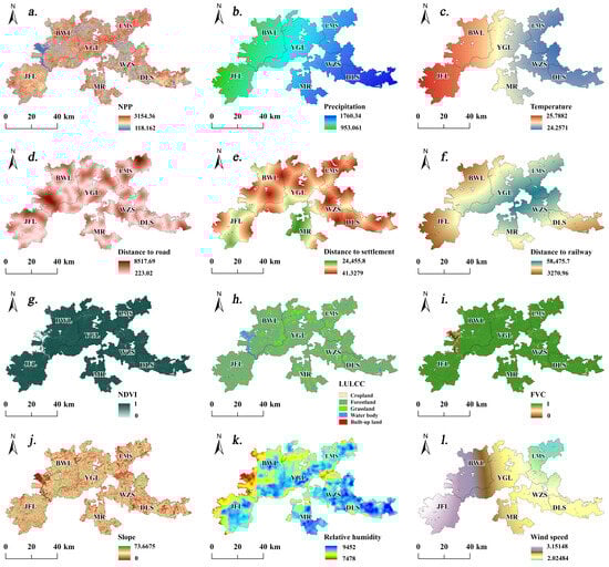 Spatial distribution of various parameters. Notes: (a) net primary productivity, (b) precipitation, (c) temperature, (d) distance to road, (e) distance to settlement, (f) distance to railway, (g) normalized difference vegetation index, (h) land use and land cover change, (i) fractional vegetation cover, (j) slope, (k) relative humidity, and (l) wind speed.