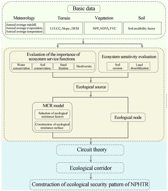 The establishment of an ecological security pattern (ESP) is critical for promoting high-quality development and ensuring human well-being. The current discourse on ESP has gained significant traction [,]. The main field of research has transitioned from biodiversity conservation to the assessment of the equilibrium between human society and ESFs []. The research scale has also shifted from macro-level assessments of the impact of national ecological protection and construction engineering technologies to regional-level assessments of ecosystem integrity []. Additionally, the direction of research has transitioned from qualitative landscape planning and analysis to the theoretical analysis of spatio-temporal patterns that are based on physics and RS, employing various methods, models, and indicators []. This research now primarily focuses on arid and semi-arid regions [], mountainous areas [], karst areas [], and other complex topographical locations and sensitive but vulnerable areas. It also encompasses various spatial scales such as counties [], provinces [], river basins [], and urban agglomerations []. In recent years, Chinese scholars have developed an ESP research paradigm that is based on the following steps, the “identification of ecological sources (ESs)—establishment of resistance surfaces—extraction of ecological corridors (ECs)” [,]. The methods for extracting ECs include techniques based on the importance of ecological conservation and landscape connectivity [], the minimal cumulative resistance (MCR) model [], and circuit theory []. Numerous studies demonstrate that integrating the MCR model and circuit theory offers significant advantages in extracting ECs and exploring regional ESPs [,]. However, research on the national parks with ecological safety barriers and their abundant biodiversity, intricate ecosystems, and crucial species habitat resources remain inadequate. Most research conducted on national parks primarily focuses on assessing ESFs [,], fostering active community participation [], and promoting ecotourism []. The study of the construction of ESP and EC with comprehensive physical or geographical patterns in national parks often faces the challenge of overcoming existing administrative units, which makes reference cases relatively rare. Sensitivity assessments, EC construction, and the exploration of ESFs in collaboration with the National Park of Hainan Tropical Rainforest (NPHTR) are insufficient. The collaborative mechanism for constructing and optimizing ESPs in national parks, which is specifically aimed at protecting endangered wildlife and enhancing ESFs, requires further clarification.