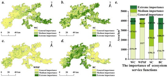 The extreme importance of the NPHTR is attributed to its SC and BC, which have respective area proportions of 31.84% and 26.65% (Figure 4). Following these is its WC, while its WPSF is the least important, with a general importance of 78.19%. WC is predominantly characterized by general and medium importance, accounting for 50.20% and 34.36% of the NPHTR, respectively (Figure 4e). It is primarily distributed in JFL, BWL, and YGL, with a pronounced concentration in the eastern areas (Figure 4a). BC is characterized by a dominant presence of areas of general and medium importance, spanning extensive areas of 1731.37 km2 and 1400.13 km2, respectively. However, the spatial distribution of BC exhibits a distinct contrast to that of WC, showing a low distribution pattern in the east and a high distribution in the west (Figure 4b). SC is predominantly classified as of medium and extreme importance, as it constitutes 36.58% and 31.84% of the NPHTR, respectively, and is distributed throughout most regions within the NPHTR (Figure 4d). The dominant feature of WPSF is the prevalence of areas of general importance, which account for 78.18% of the total study area (Figure 4c). With the exception of JFL, BWL, and YGL, there are some continuous areas of medium importance, while all the other regions are characterized as being of general importance. This is because the rainforest is extremely resistant to wind erosion, so there is no significant difference in WPSF throughout the national park.