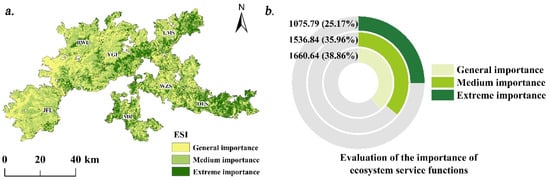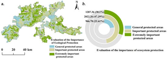 Evaluation of the importance of ecological protection. Notes: (a) spatial distribution of the importance of ecosystem protection, (b) evaluation of the relative importance of ecosystem protection.