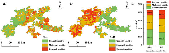 The extremely sensitive areas in terms of the SSE in the NPHTR span 600.09 km2, representing 14.06% of the overall NPHTR. They are primarily situated in tropical lowland rainforests with low-relief terrain in DLS, WZS, YGL, and MR (Figure 6). Their regional soil erosion is evident due to consistently high precipitation and the characteristic mountainous and hilly red soil in this area. The generally sensitive and moderately sensitive areas of the SLD account for 75.98% of the total of the NPHTR. Their distribution features are higher in the western and lower in the eastern parts, particularly in the sensitive areas of BWL, JFL, and YGL (Figure 6b). This indicates that the disparity in rainfall between the western and eastern sides of the NPHTR significantly impacts ecosystem sensitivity.