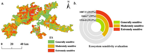 Integrated evaluation of ecosystem sensitivity. Notes: (a) comprehensive sensitivity assessment level of the ecosystem, (b) proportion of the comprehensive sensitivity assessment covered by each level.