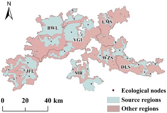 ESs are crucial patches that play a pivotal role in providing essential ESFs and facilitating ecological processes while serving as vital habitats for wildlife []. The effective identification of these ESs is achieved through a comprehensive analysis of ecosystem services that incorporates both qualitative and quantitative approaches. Similarly, ecological nodes generally refer to the critical ESFs within ESs. Enhancing the protection of ecological nodes contributes to improving ecosystem connectivity. In this study, an initial rigorous screening process was conducted to identify extremely important protected areas, followed by the consolidation and integration of important ecological regions within the NPHTR to delineate the ESs. Finally, we chose the center point of the ESs as the ecological nodes [].