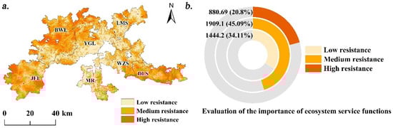 Spatial distribution of ecological resistance in NPHTR. Notes: (a) spatial distribution characteristics of resistance surfaces and (b) proportion of different resistance surfaces.