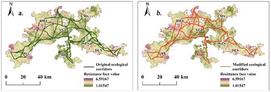 Comparison of ECs of NPHTR before and after revision. Notes: (a) original ecological corridors, (b) modified ecological corridors.
