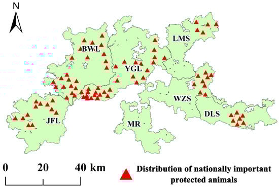 The construction methods of an ESP mainly focus on the qualitative determination and quantitative analysis of ESs [,]. Their quantitative identification at the regional scale is mainly based on the use of ecosystem services, and an ecological sensitivity analysis is mainly used at the urban scale. Luo et al. conducted a simulation of the spatial characteristics of the ESP in the Weihe River Basin in 2040 under various scenarios, with the aim of determining an optimal model for sustainable development that balances biodiversity and economic growth in the region []. Meanwhile, Zhang et al. constructed an ESP for the Chengdu–Chongqing economic circle to address regional development and ecological protection conflicts []. Moreover, as the cornerstone of China’s natural protected area system, national parks are established with the primary objective of preserving the authenticity and integrity of natural ecosystems and maintaining biodiversity and ecological security barriers []. The constructed ECs of the NPHTR serve a dual purpose: firstly, they mitigate the habitat fragmentation caused by urban areas, rural settlements, roads, and various authorities in the region []. Secondly, they facilitate species diffusion and migration through the establishment of a corridor system while enhancing connectivity between islands within the protected area []. Thus, the multifunctional service capacity of tropical rainforests can be improved [,]. The distribution of nationally important protected animals in the NPHTR, as depicted in Figure 13, is primarily concentrated in BWL and JFL, aligning remarkably with our identified ecological functional areas. Notably, within BWL, the exceptional habitat quality and dense ECs provided by the ESP have expanded the potential migration routes for Nomascus hainanus and Cervus eldii hainanus. According to survey data, there has been a significant increase in the Nomascus hainanus population from approximately 33 individuals across five groups in 2020 to nearly 42 individuals distributed among seven groups by 2024 (https://www.hntrnp.com/ (accessed on 20 May 2024)).