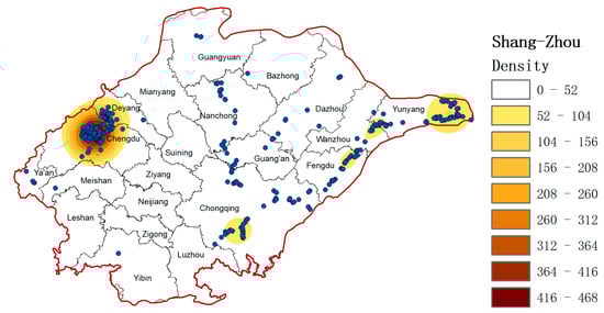 Kernel density of ancient settlements in the Shang–Zhou Period in Sichuan Basin.
