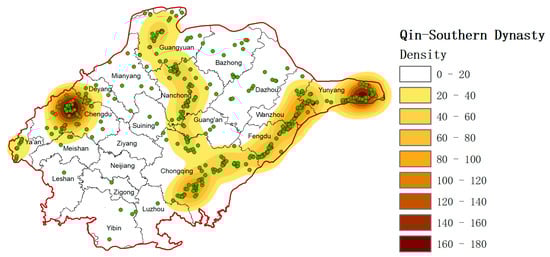 Kernel density of ancient settlements in the Qin–Southern Dynasties in Sichuan Basin.