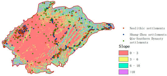 The term “slope” effectively describes the morphology and structural characteristics of the land surface. Areas with significant slopes are generally unsuitable for human production activities, with the upper limit for optimal cultivation land slope typically set at 15° [35]. In accordance with the findings from the ArcGIS slope analysis, this paper categorizes the slope into four grades: 0–3°, 3–6°, 6–10°, and 10° or more. This classification is based on the topographic characteristics of the Sichuan Basin, which predominantly features plain and hilly terrain, with a limited proportion of steep and very steep slopes. The relationship between ancient settlements and slopes in the Sichuan Basin is illustrated in Figure 6.