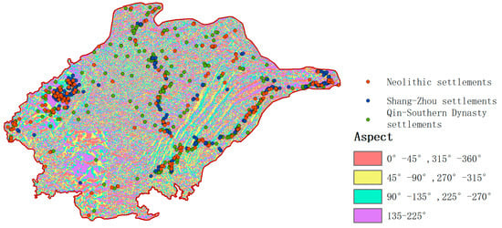 As illustrated in Table 4, there exists a discernible negative correlation between slope and the distribution of sites. Specifically, a steeper slope corresponds to a reduced number of distributed settlements. The highest concentration of sites, accounting for 65.55% of the total, is observed within the 0–3° slope range during the Neolithic Period. This percentage increases to 73.60% in the Shang and Zhou Periods, and it subsequently decreases to 56.43% during the Qin to Southern Dynasties. This slope range is situated in close proximity to water sources, which facilitates agricultural activities. Notably, the proportion of settlement sites within the 3–6° slope range increased during the Qin to Southern Dynasties. This trend suggests that ancestors were capable of cultivating arable land with a moderate slope and chose to settle there, likely due to enhancements in productivity levels during this period. Overall, the distribution of settlements tends to concentrate in areas characterized by micro-slopes and gentle slopes, while the number of settlements located on steeper slopes remains comparatively limited.