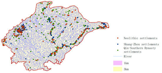 The significance of water as a vital resource for the survival of early humans cannot be overstated. Indeed, the locations of early settlements were largely influenced by the availability of water. Therefore, it is crucial to develop a comprehensive understanding of the relationship between these settlements and the surrounding water systems. The accessibility of water resources and their proximity determine the residents’ ability to obtain sufficient water and facilitate convenient agricultural irrigation, thereby ensuring a safe living environment that mitigates the risk of flooding. Using ArcGIS 10.8, 1 km, 2 km, and 3 km river buffer zones were established for each major river in the Sichuan Basin. Subsequently, the distribution of sites from the Neolithic Period to the Qin–Southern Dynasties was analyzed concerning their distance to water sources. As shown in Figure 8, with the exception of the dense concentration of sites found in the Chengdu Plain, most other sites display a linear distribution along rivers.