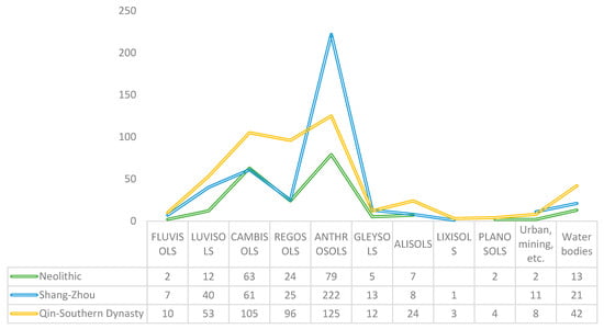 The data presented in Figure 9 demonstrate that Luvisols, Cambisols, Regosols, and Anthrosols are the four main soil types related to the settlements. In the Neolithic Age, the proportion of sites located on the four main soil lands was 85.17%, in which Anthrosols and Cambisols accounted for the highest percentage of 37.80% and 30.14%. In the Shang and Zhou Periods, the proportion of sites located on the four main soil lands was 85.09%, in which Anthrosols accounted for the highest percentage of 54.28%, followed by Cambisols at 14.91%. In the Qin–Southern Dynasties period, the proportion of sites located on the four main soil lands was 78.63%, in which Anthrosols, Cambisols, and Regosols accounted for the higher percentage of 25.93%, 21.78%, and 19.92% respectively. A comparative analysis of the data indicates that Neolithic and Shang–Zhou settlements were more sited on the four main soil types than those from the Qin–Southern Dynasties Period.