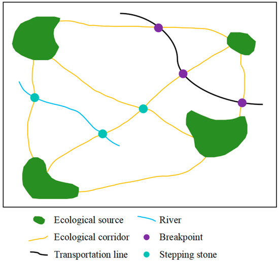 ESP is composed of ecological sources, ecological corridors, and strategic points [9,12]. Ecological sources are habitats for target species or areas that provide a wide range of ecosystem services (ESs) for human well-being [13,14]. Ecological corridors connect ecological sources, allowing for species migration or matter and energy delivery among them [14,15]. The least cost path analysis (minimum cumulative resistance model), connectivity analysis, and circuit theory have been used for identifying the potential corridors [6,16,17]. Strategic points are sites that are critical for ecological process maintenance and species dispersal or vulnerable to risks [18], including stepping stones and possible barriers. Possible barriers are sections of ecological corridors in which human activities are frequent, while stepping stones are locations that provide resting spots for species during long-distance migrations and therefore require particular attention [19] (Figure 1).