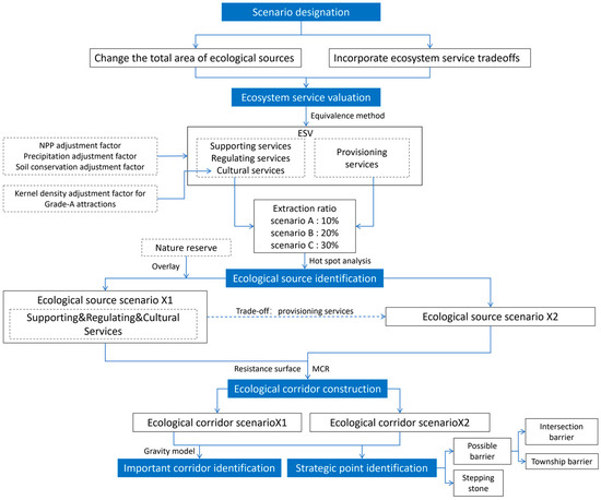 We started the empirical study with the scenario design and followed the “source-corridor” framework for ESP mapping that comprised the following four main procedures: identifying ecological source identification, constructing ecological resistance surfaces, simulating ecological corridors, and identifying strategic points [14,33]. The workflow of this study is shown in Figure 3. The methods for each procedure are explained in detail below.