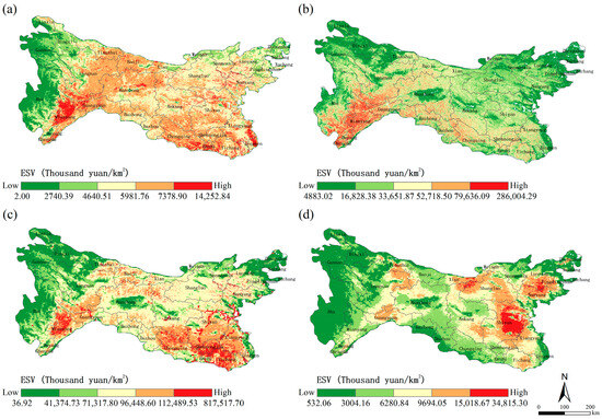 Spatial distribution of four ESVs in the Qinling-Daba Mountain area: (a) provisioning service, (b) supporting service, (c) regulating service, (d) cultural service.
