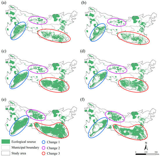 Based on the results of ES valuation, we identified the ecological sources in six scenarios and mapped them in Figure 6. The statistics of the ecological sources in each scenario are summarized in Table 5.