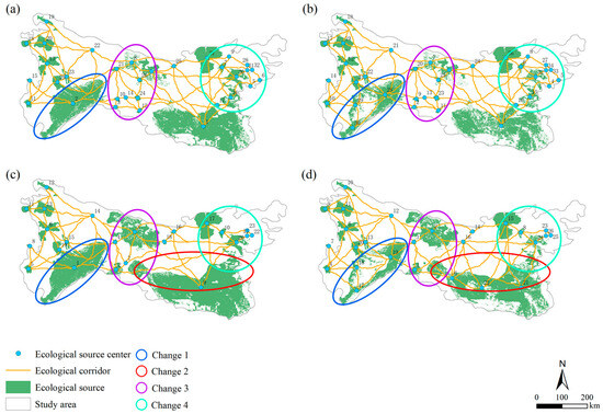 Ecological corridors in different scenarios in the Qinling-Daba Mountain area: (a) Scenario B1, (b) Scenario B2, (c) Scenario C1, (d) Scenario C2. Change 1 indicates the change in ecological corridors in the Min Mountain region, Change 2 indicates the change in ecological corridors in the Daba-Shennongjia Mountain area, Change 3 indicates the change in ecological corridors in the Qinling Mountain and Micang Mountain, and Change 4 indicates the change in ecological corridors in the Funiu Mountain.
