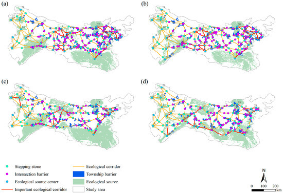 As for strategic point identification, this study identifies the intersections of two ecological corridors or those of ecological corridors and waterbodies as “stepping stones” facilitating species migration [52]. In contrast, the intersections between ecological corridors and the sites with intensive human activity are taken as “possible barriers”, which hinder species movement and increase migration challenges between different ecological sources. Specifically, this study sets the intersections of ecological corridors and transportation lines (mainly highways and railways) as “intersection barriers” [53] and identifies townships on ecological corridors and with high population density (population density > 100 people/km2) as “township barriers”.