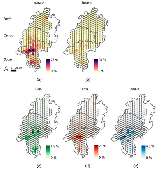 Figure 2. Hexagonal grids of traditional orchard density in Hesse for (a) historical (1952–1967), (b) recent (2008–2010), (c) gained, (d) lost, and (e) remaining orchards. Grey lines delineate government districts, which define the regional level in this study.
