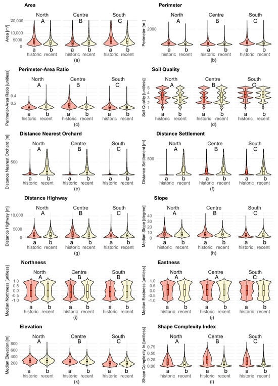 Figure 3. Comparison of the twelve computed traditional orchard attributes between the three regions and between the historical (1952–1967, red) and the recent (2008–2010, yellow) data. The capital letters above the violin plots indicate significant differences in the comparisons between the regions for both historic and recent data, and the small letters below the violin plots indicate significant differences in the comparisons between historic and recent data within each region (p-value ≤ 0.05). Orchard attributes include (a) Area, (b) Perimeter, (c) Perimeter-Area-Ratio, (d) Soil Quality, (e) Distance Nearest Orchard, (f) Distance Settlement, (g) Distance Highway, (h) Slope, (i) Northness, (j) Eastness, (k) Elevation, and (l) Shape Complexity Index.