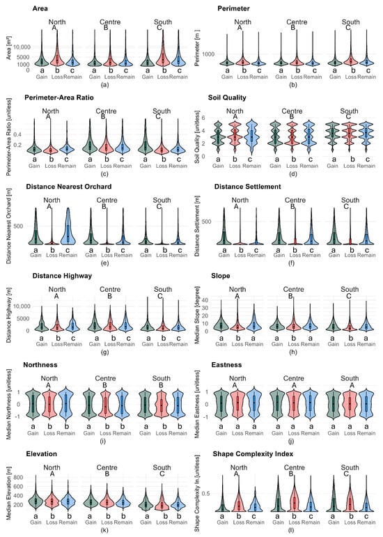 Figure 4. Comparison of the twelve computed traditional orchard attributes of the three regions and between the newly established or gained (green), lost (red), and remaining (blue) traditional orchards for the time spans 1952–1967 and 2008–2010. The capital letters above the violin plots indicate the significant differences in the comparisons between the regions of gained, lost, and remaining orchards, and the small letters below the violin plots indicate significant differences in the comparisons between gained, lost, and remaining orchards within each region (p-value ≤ 0.05). Orchard attributes include (a) Area, (b) Perimeter, (c) Perimeter-Area-Ratio, (d) Soil Quality, (e) Distance Nearest Orchard, (f) Distance Settlement, (g) Distance Highway, (h) Slope, (i) Northness, (j) Eastness, (k) Elevation, and (l) Shape Complexity Index.