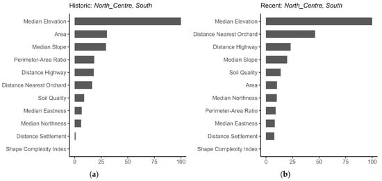 Comparing the remaining with the newly established orchards, the most notable differences were related to Area, Distance Nearest Orchards, and Distance Settlement. Newly established orchards were slightly (Centre) or clearly (South) smaller than the older orchards from 1952 to 1967, while in the North they were actually about 10% larger. Similarly, the distances between remaining orchards were, on average, smaller in the Centre and in the South, but clearly larger in the North compared to the distances between the newly established orchards. In contrast, the distance to settlements showed consistent patterns. The remaining orchards in all regions were located closer to settlements than the newly established orchards, with minimum distances for the older orchards occurring in the North and maximum distances occurring in the South (Figure 4, Tables S4–S6).