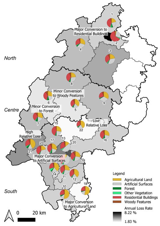 To examine a potential north–south gradient regarding the drivers of orchard loss at the local level, the y-coordinate of each district centre was extracted and correlated against the percentage/area of each LULC class using the Spearman–Rank correlation [68].