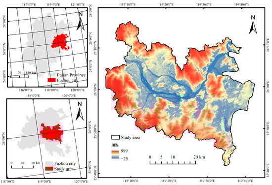 The downtown area of Fuzhou City is located on the southeast coast of China (25°15′–26° 39′ N ~118° 08′–120° 31′ E), with a total area of about 2212.94 km2. The climate is warm and humid, with an average annual temperature of 16–20 °C. It has a typical subtropical monsoon climate. The main city of Fuzhou is surrounded by mountains, with an elevation of 600–1000 m above sea level, which is a typical estuarine basin. With the continuous expansion of urbanization scale in recent years and the barrier of the mountains, the trend of its urban expansion is along the river to the sea, eastward, and southward (Figure 1).