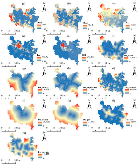 Land use driving factors. (a) DEM; (b) slope; (c) precipitation; (d) POP; (e) GDP; (f) Dis_water; (g) Dis_railway; (h) Dis_expressway; (i) Dis_city road; (j) Dis_station, (k) Dis_government; (l) Dis_Core; (m) Dis_corridor.