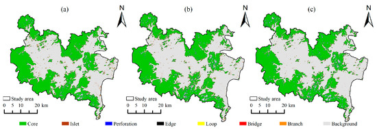 Spatial distribution of MSPA landscape types. (a) 2012; (b) 2017; (c) 2022.