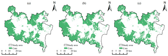 Morphological Spatial Pattern Analysis (MSPA) is a model based on mathematical morphology algorithms for processing binary images and is often used to determine forest geometry and extract ecological source sites. It is able to classify land classes with ecological value, such as woodland and grassland, into seven landscape structures, namely Core, Islet, Perforation, Edge, Loop, Bridge, and Branch [35,36]. In our study, woodland, shrubland, and grassland in 2012, 2017, and 2022 were selected as foreground data and pre-processing of the data was carried out using GuidoToolbox3.0 analysis software with 8-domain method and the edge width set to 1, which is the smallest unit of the raster, and 30 m. At the same time, the most ecologically valuable core areas of the seven landscape types were extracted, and the results of the three years were intersected to obtain the preliminary core area patches that were more stable in 10 years.