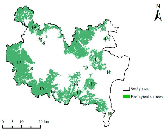 By extracting woodland, shrubland, and grassland with ecological value, the landscape types were extracted by using the MSPA method (Figure 3, Table 7). The results showed that the landscape types in the center of Fuzhou City were mainly dominated by Core, followed by Edge. However, with the advancement of urbanization, the areas of Core, Islet, Loop, Bridge, and Branch landscape types all decreased, while Perforation and Edge increased by 31.86% and 10.80%, respectively, during the 10-year period, indicating that the edge areas between the patches in the study area increased, and the integrity and connectivity deteriorated. In terms of spatial distribution, the core area is mainly distributed near the surrounding mountains in the study area, while the smaller core area in the center has been gradually affected by urban expansion in recent years, and its area has been gradually reduced (Figure 4). After overlaying the core areas of the three phases, we extracted a total of 19 ecological source sites, of which the largest ecological source site was No. 12, with an area of 118.22 km2, while the smallest source site was No. 3, with an area of 0.5049 km2 (Figure 5).