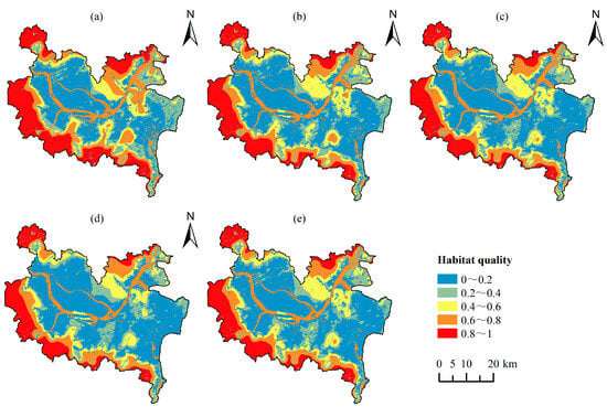 Habitat quality by period. (a) 2012; (b) 2017; (c) 2022; (d) 2027 natural state; (e) 2027 corridor constraints.