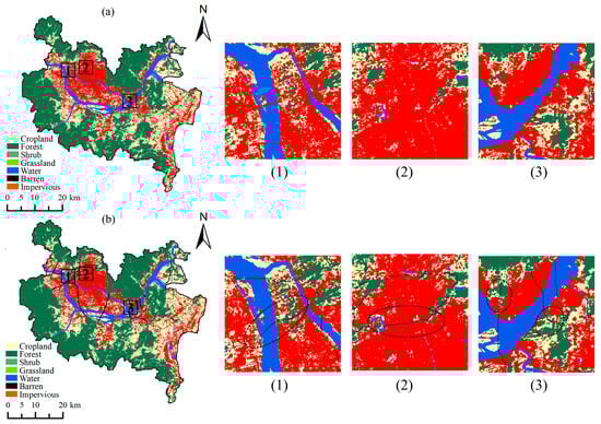2027 land use simulation projections. (a) Natural state; (b) corridor constraints.